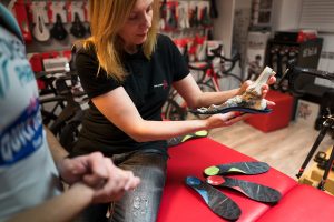Nogi: sprawdzamy m.in. strukturę budowy stóp i ich wysklepienie oraz ustawienie kolan (płaskostopie u kolarzy jest mile widziane…). Dzięki tej ocenie można dopasować wygodne buty lub wkładki korygujące. W czasie badania można również określić, czy nogi są równej długości. Jeśli nie – istotne jest również, czy nierówność ta dotyczy długości kości udowej czy piszczelowej. Ma to znaczenie, ponieważ inaczej koryguje się wówczas sylwetkę na rowerze (podkładkami pomiędzy butem a blokiem lub ustawieniem samych bloków).